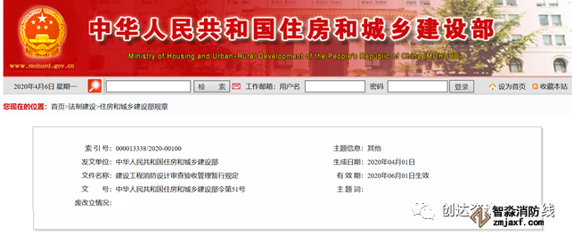 ?2020年4月4日,住建部發布《建設工程消防設計審查驗收管理暫行規定》(以下簡稱《規定》),2020年6月1日生效。《規定》明確國務院住房和城鄉建設主管部門負責指導監督全國建設工程消防設計審查驗收工作;并設定首要責任、主體責任和個人責任等規定。